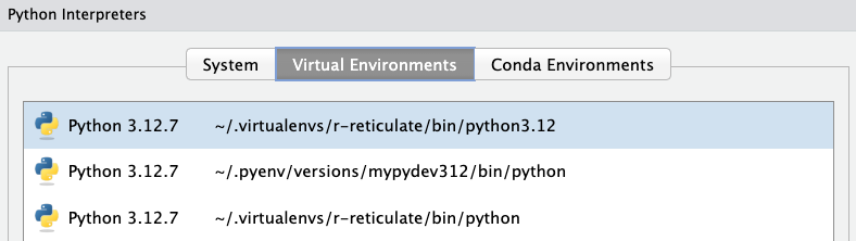 Click on it, you can select the one you would like. We are using the virtual environment mypydev312 so this is the one we choose.