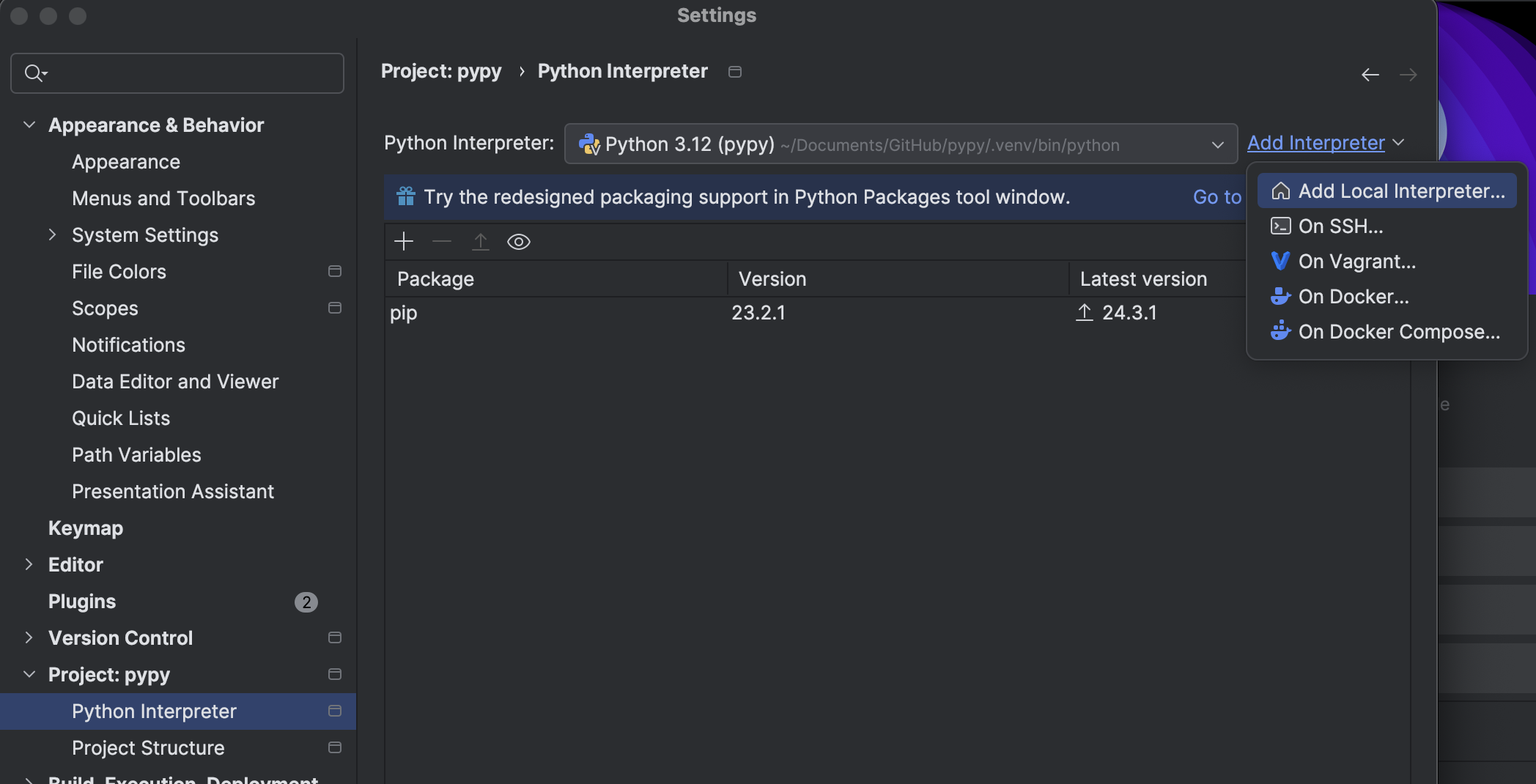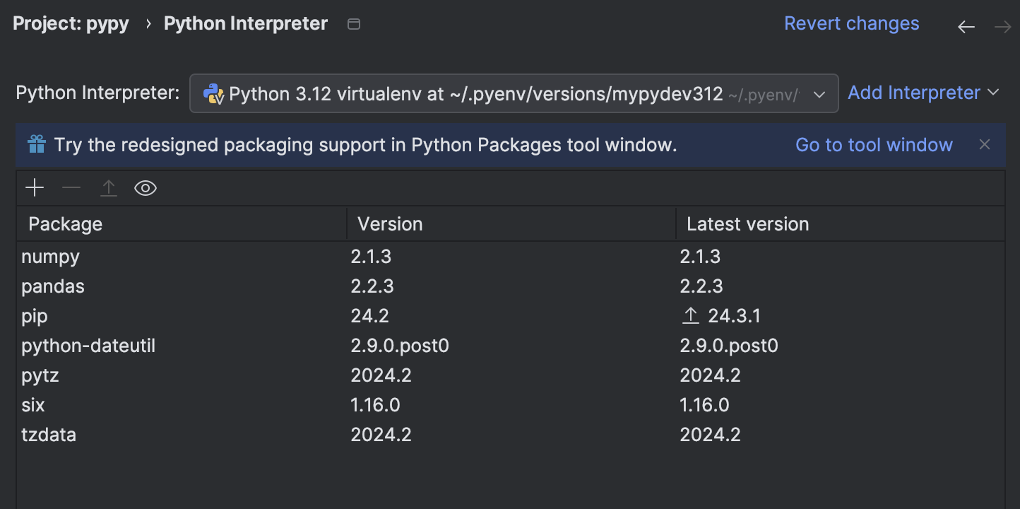 Go to Settings -> Project -> Python Interpreter. You might see that the packages you want are not available; as we have installed numpy in our virtual environment mypydev312, this is expected.