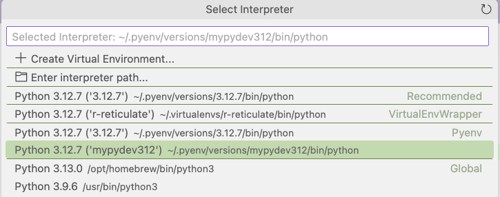 pyenv activate mypydev312 # (mypydev312) should be printed in front of your user nameInside the virtual environment, can also check which python version.