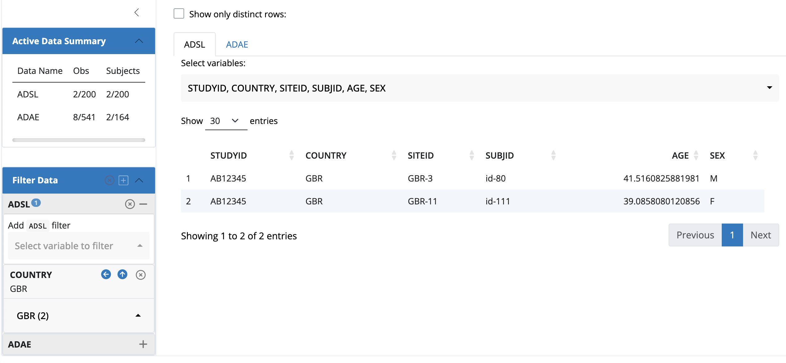 data$ADSL[1:6,1:6] # only print the first 6 rows and 6 columns STUDYID COUNTRY SITEID SUBJID AGE SEX