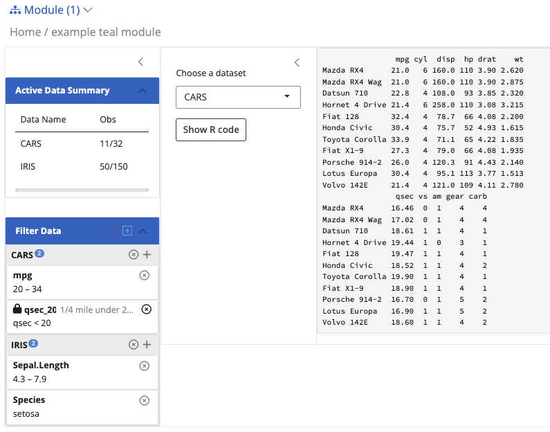 teal_slice(dataname = "CARS", expr = "qsec < 20", title = "1/4 mile under 20 sec", id = "qsec_20")